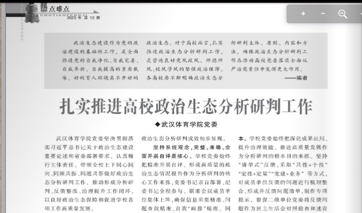 武汉体育学院党委坚决贯彻落实习近平总书记关于政治生态建设重要论述和省委部署要求,认真履行主体责任,带领全校上下同心同向、同频共振、同题共答做好政治生态分析研判工作,推动形成分析研判、反馈整改、治理提升工作闭环,以良好政治生态保障和促进学校各项工作高质量发展。